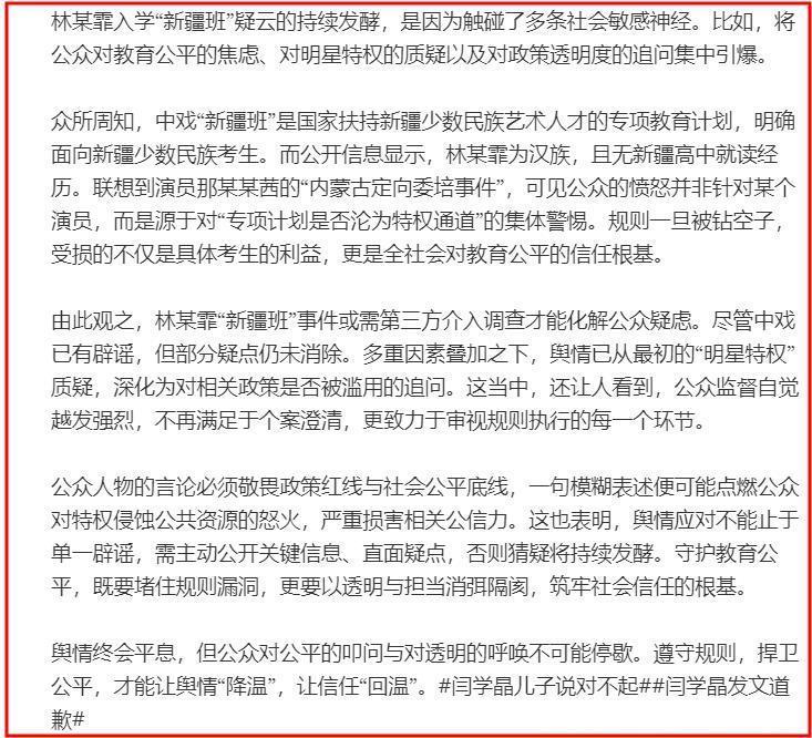 这下不得了,这引发了网友对教育公平公平的焦虑和对明星特权的质疑。因此网友质疑林傲霏就读中戏新疆班的合规性。