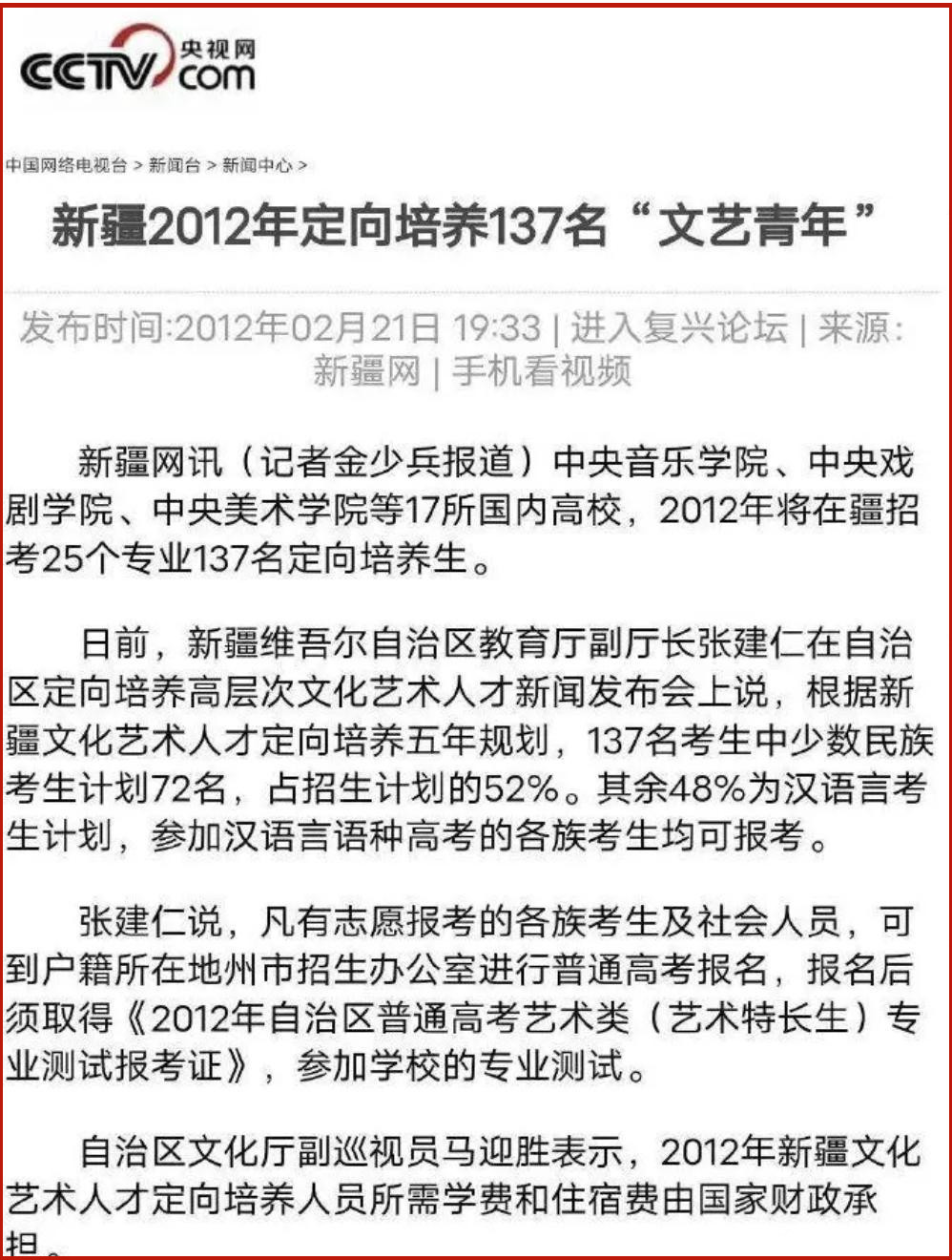 从央视网的报道中可以看到,2012年,中央音乐学院、中央戏剧学院、中央美术学院等17所国内高校在新疆招考25个专业,137名定向培养生。